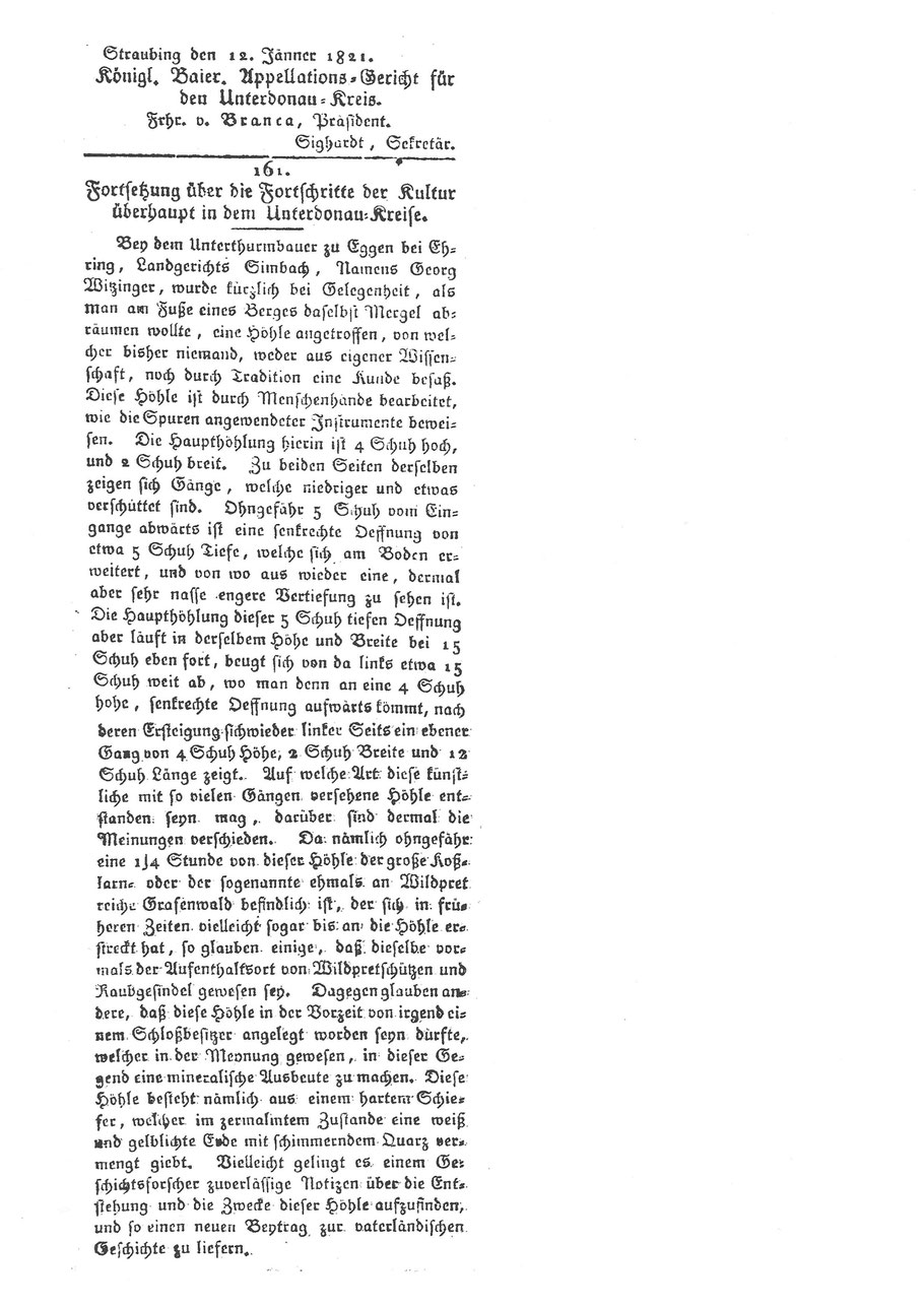 Erst ein sehr alter Beschrieb vom 12. Januar 1821 von Frhr. V. Branca, Präsident des Königl. Baier. Apellations-Gerichts für den Unterdonau-Kreis (Sighart, Sekretär), brachte mehr Licht ins