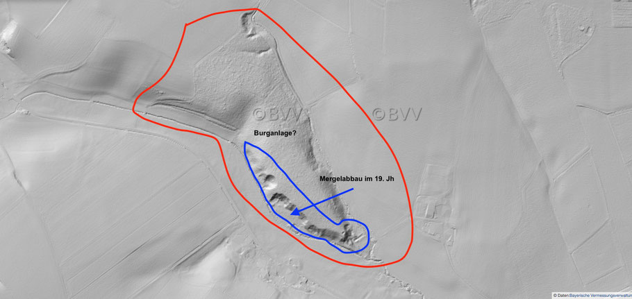 Das Geländemodell im Bayernatlas lässt die Geländezunge mit dem abgebauten Mergel ebenfalls bestätigen.