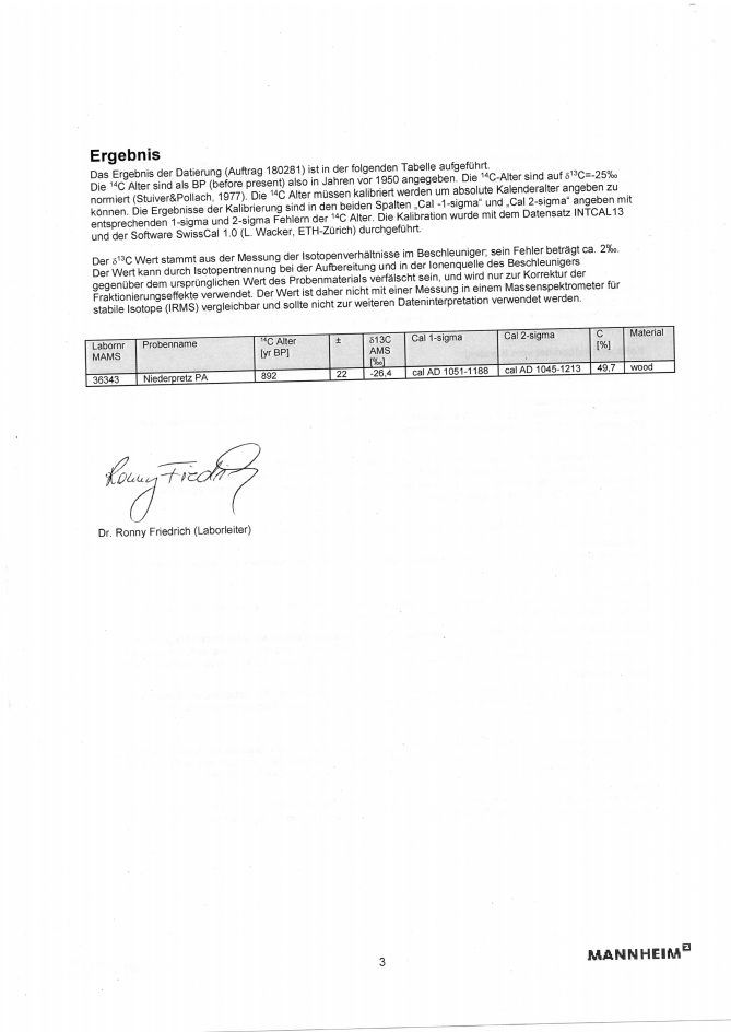Das BLfD Regensburg hat 2018 ein Holzstück aus dem Erdstall Niederpretz II im „rem – Klaus-Tschira-Archäometrie-Zentrum an der Universität Heidelberg“ untersuchen lassen[1]