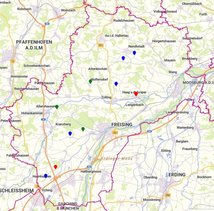 Die im Erdstallkataster für den Landkreis Freising erfassten 11 unterirdischen Gänge/Anlagen verteilen sich geografisch sowie hinsichtlich ihrer Klassifizierung wie folgt: